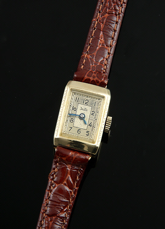 Zentra. Gehäuse GG 585. 22 x 14 mm. Goldenes Zifferblatt, schwarze arab. Ziffern, gebläute Zeiger. Handaufzug, gangbar. Nur mäßige Gebrauchsspuren. Braunes Lederarmband mit Dornschließe.