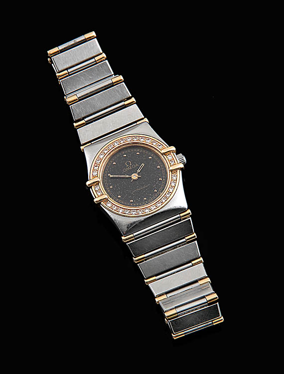 Omega Constellation. Ca. 1987. Edelstahl, GG 750, 32 Diamanten. D 23 mm. Schwarzes Zifferblatt, vergoldete Ziffernpunkte, Quartzwerk, gangbar. Gebrauchsspuren, Zifferblatt mit Altersflecken.