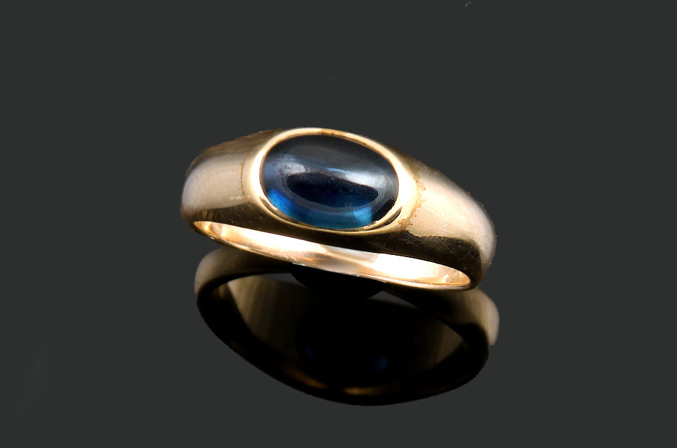 GG 14 ct (geprüft). Blauer Saphircabochon. D innen 17 mm. 4,4 g brutto.