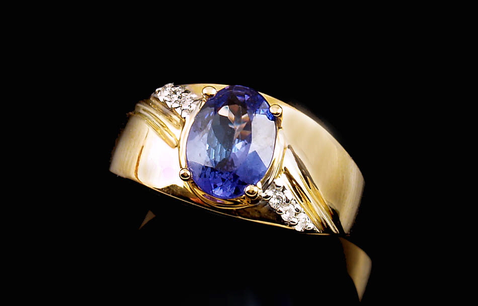 GG 585. Tansanit DeLuxe (AAAA), oval, facettiert, 9,0 x 7,0 mm, 2 ct, 6 Brillanten, zus. 0,06 ct, TW, si. D innen 17 mm. 3,9 g brutto.