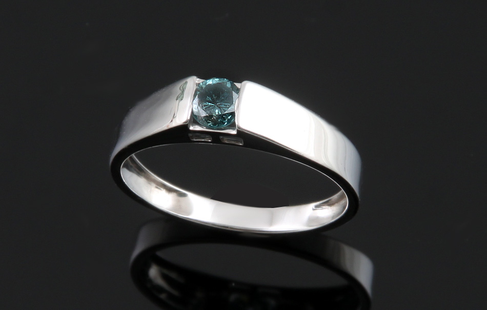 WG 375. Hellblauer Brillant (sky blue), ca. 0,33 ct, P1. D innen 18 mm. 1,7 g brutto.