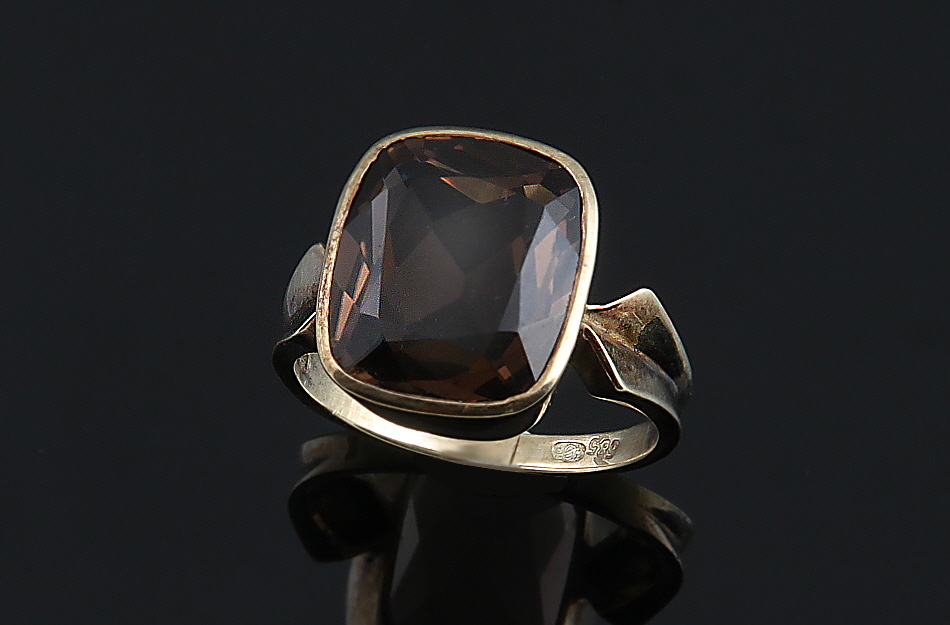 GG 585. Konischer, rechteckiger Aufsatz mit facettiertem Rauchquarz. D innen 17,5 mm. 5,6 g brutto.
