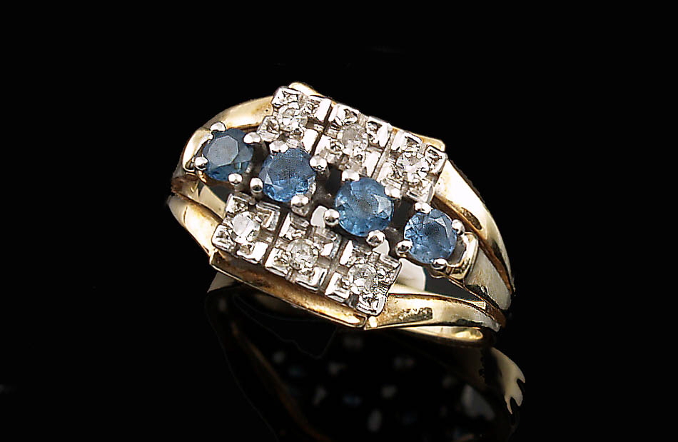 GG 585. Schiene oben aufgeschnitten mit rechteckigem Aufsatz. 4 blaue Saphire, 6 Diamanten mit Achtkantschliff, zus. ca. 0,30 ct, W, si-P1. D innen 18 mm. 5 g brutto.