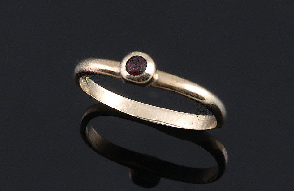 GG 333. Kleiner, runder Aufsatz mit Granat. Oberfläche des Steins abgenutzt. D innen 18 mm. 1,7 g brutto.