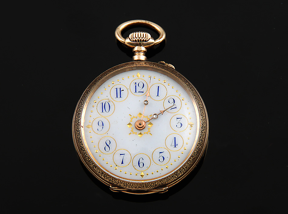 Anfang 20. Jh.. Gehäuse GG 585, innerer Staubdeckel Metall. D 32,5 mm. Emailzifferblatt mit blauen arab. Ziffern und Goldpunkten, Goldzeiger. Zeigerstelldrücker bei 1. Handaufzug über Krone, gangbar. Im Rand mehrere winzige Dellen, sonst schöner Erhaltungszustand.