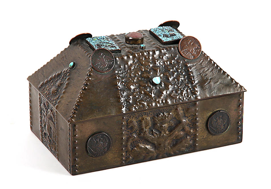 Rechteckig mit schräg ansteigendem Deckel. Braun patiniertes Messingblech. Zur Verzierung wurden verschiedene Elemente verwendet, darunter Münzen, türkisfarbene Steine und ein roter Karneol-artiger Stein in der Mitte der Deckeloberseite. L 18,5 cm, B 11,6 cm, H 11,2 cm.