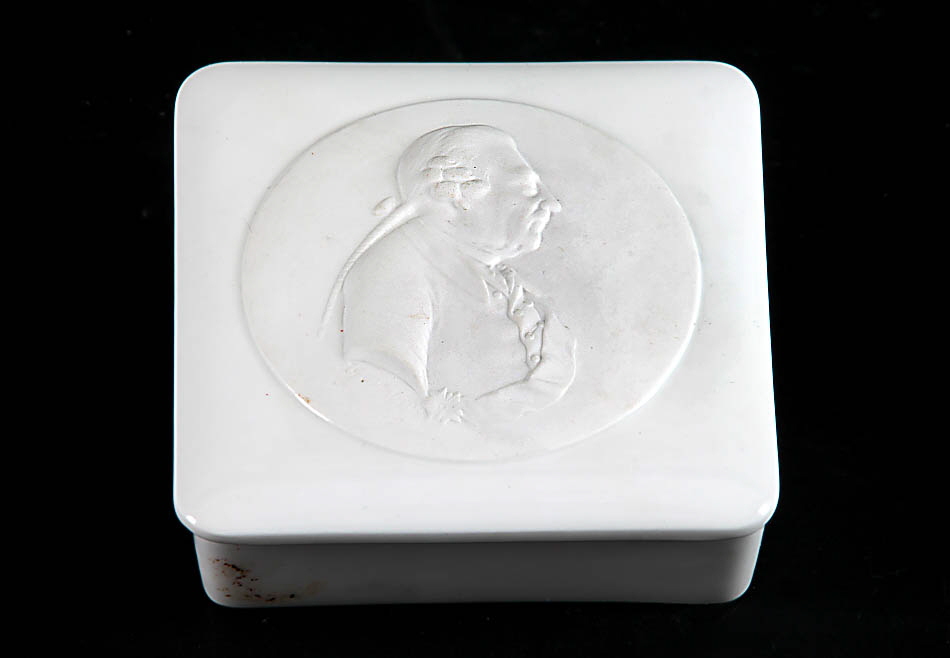 KPM Berlin, blaue Zeptermarke, 1960er-80er Jahre. Quadratische Form, flacher Deckel mit Rundrelief, Darstellung Friedrich der Große im Profil. Weißporzellan. 11 x 11 cm.
