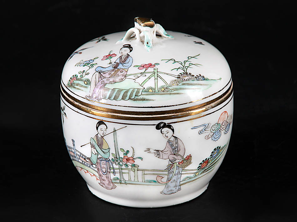 China, am Boden rote Siegelschriftmarke, ca. Ende 19./Anfang 20. Jh.. Runde, bauchige Form, gewölbter Deckel mit Fruchtnodus. Weiß glasiertes Porzellan, auf Wandung und Deckel Figurenszenen in bunter Emailmalerei, dazu schwarze Schriftzeichen. H 13 cm, D 12,4 cm.