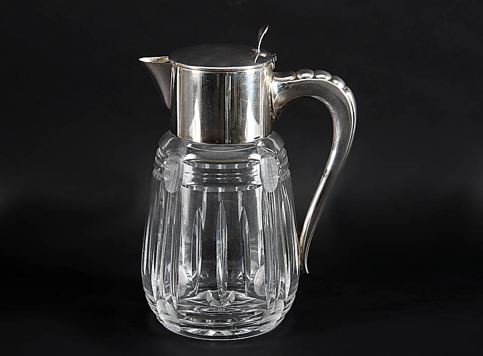 „Kalte Ente“. 1. Hälfte 20. Jh.. Farbl. Kristallglas, reicher Kerbschliffdekor, im Boden Sternschliff. Versilberte Metallmontierungen. Einsatz mit Glaszylinder fehlt. H mit Deckel 31,5 cm.