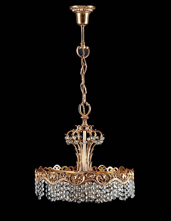 Messing vergoldet, 7-flammig. Reicher Kristallglasbehang (verschiedene Glasprismen fehlen). Aufhängung an Messingkette. H ca. 85 cm, D ca. 43 cm.