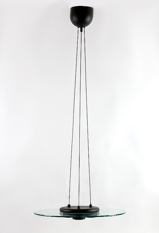 1990er Jahre. Modernes Design. Runde Glasplatte mittig mit runder, schwarz beschichteter Montierung mit drei Glühbirnenfassungen. Aufhängung an drei Stahlseilen, oben im Baldachin der Transformator. H ca. 117 cm, D ca. 50 cm. Zustand B.