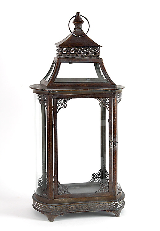 Für Balkon, Terrasse oder Garten. Gehäuse kupferfarben patiniertes Metall mit Zierdurchbrüchen. H 65 cm.