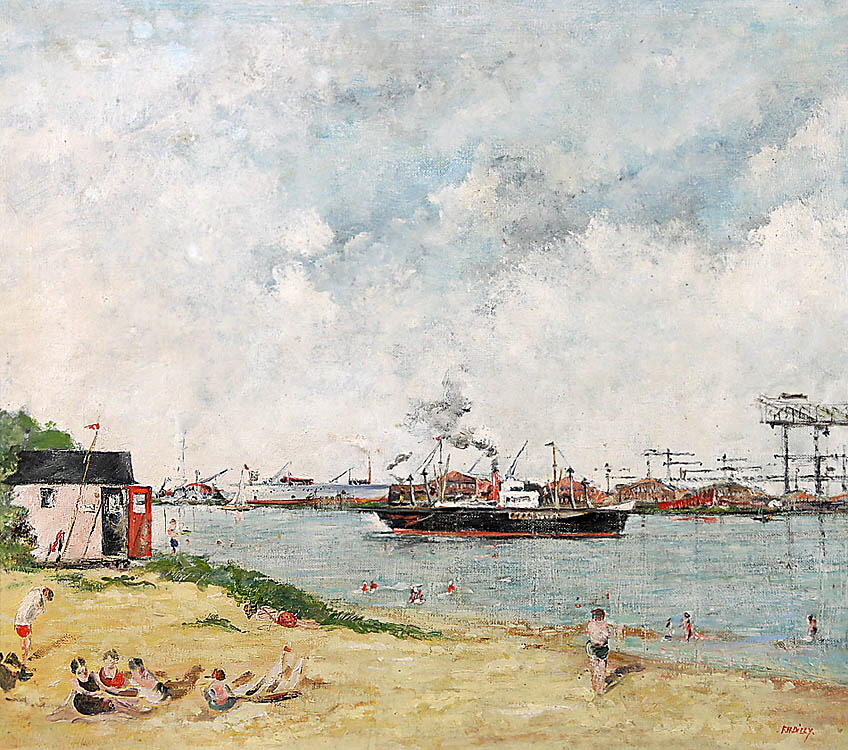 1888-1960, war ansässig in Bremen-Oberneuland; deut. Maler. Lehrer an der Folkwangschule in Essen und an der Staatl. Kunstgewerbeschule in Bremen. Studienreisen nach Holland, Belgien, Italien, Dänemark und in die Schweiz. „Belebte Hafenszene“. Re. u. sign. F.H. Dilly. Öl/Lwd., 48 x 55 cm. R..