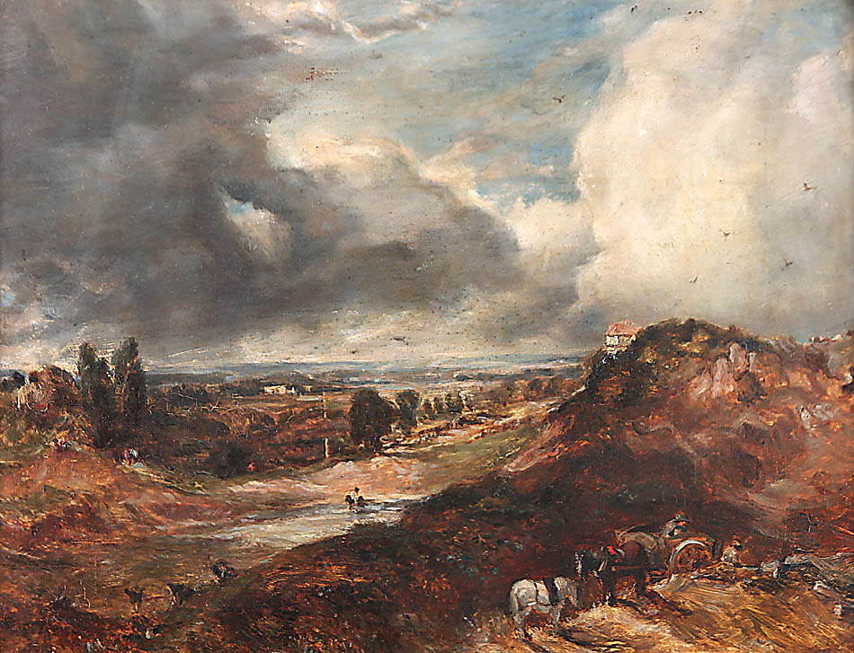 1870 Burghausen – 1939 München; deut. Maler und Restaurator, Prof.. Studium an der Münchner Akad. bei Johann Caspar Herterich und Wilhelm von Diez. „Weite hügelige Landschaft bei aufziehendem Unwetter“. Kopie nach John Constable. Unsign.. Öl/Lwd., doubl., 35 x 44,5 cm. Stuckr. (etwas best.).