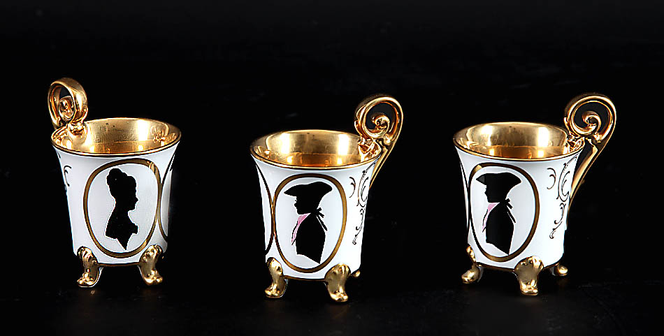 Im Stil des 18. Jhs.. Wiener Porzellanmanufaktur, Manufakturstempel. Weiße, glänzende Glasur, Golddekor, Bildnisdarstellungen in Schattenrissmanier.