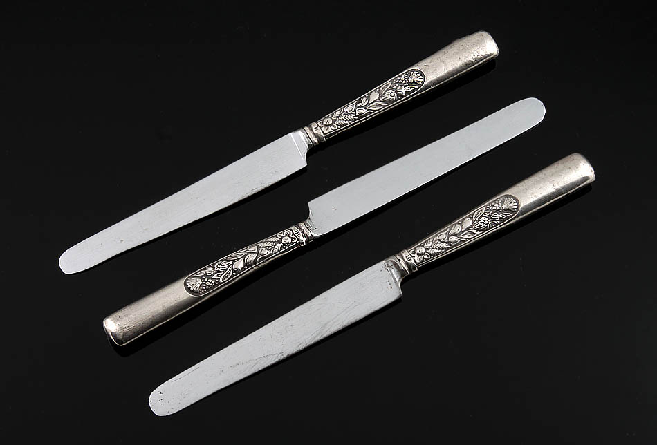 19. Jh.. Griffe 13 lotiges Silber, gefüllt. Florales Reliefmuster. Stahlklingen. L 18,5 cm.
