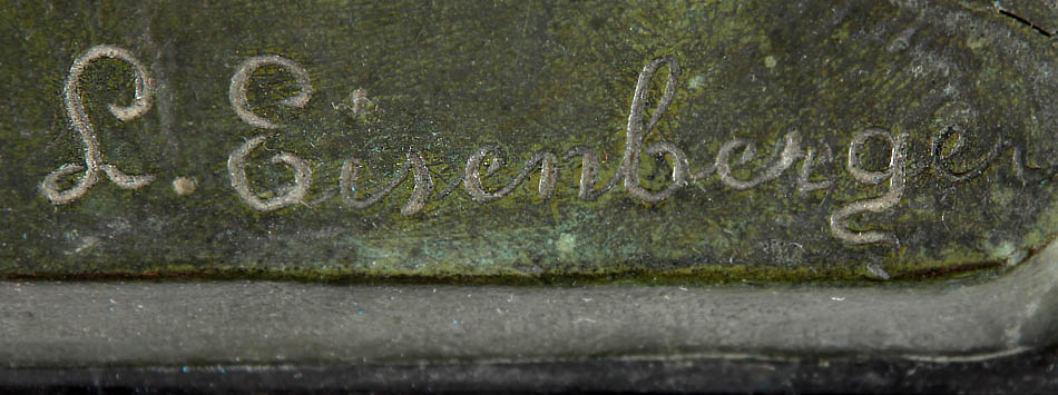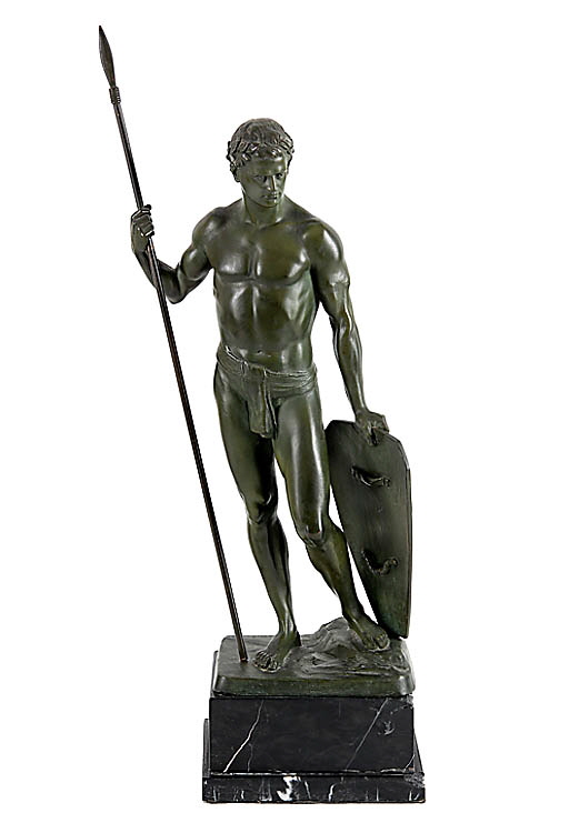 Deut. Bildhauer, war von 1895 bis 1920 in Berlin tätig. „Junger Krieger mit Speer und Schild“. Bronze, grüngraue Patina. Auf der Plinthe bez. L. Eisenberger. Marmorsockel. In der Plinthe quer verlaufender Haarriss von der Außenkante bis zum linken Fuß, Sockel an den Ecken besch.. H ohne Sockel 52 cm.