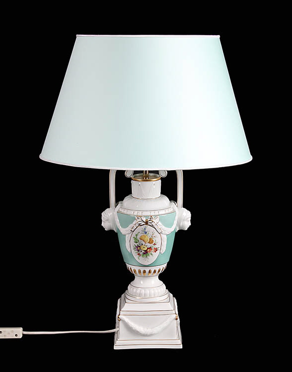 Höchster Porzellanmanufaktur, Manufakturstempel. Vasenförmiger Lampenfuß im klassizistischen Stil. Feines Reliefmuster, zwei Henkel unten mit plastischem Frauenkopf, Golddekor, zwei hochovale Kartuschen mit bunter Blumenbemalung. Konischer, mintfarbener Lampenschirm. H mit Schirm ca. 65 cm.
