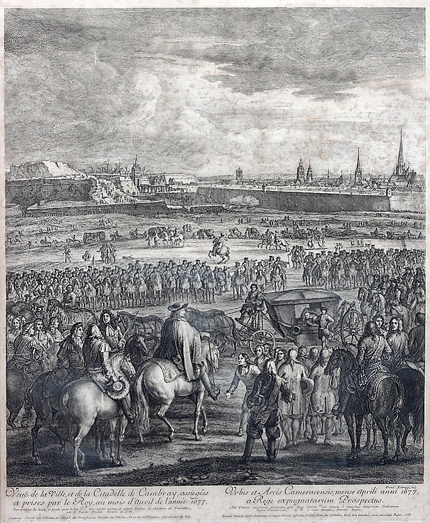 1648 Weil am Rhein – 1710 Paris. „Veue de la Ville, et de la Citadelle de Cambray“. 1685. Radierung nach einem Gemälde von Adam Frans van der Meulen (1632-1690). 58,5 x 51,2 cm. Unter Glas gerahmt.