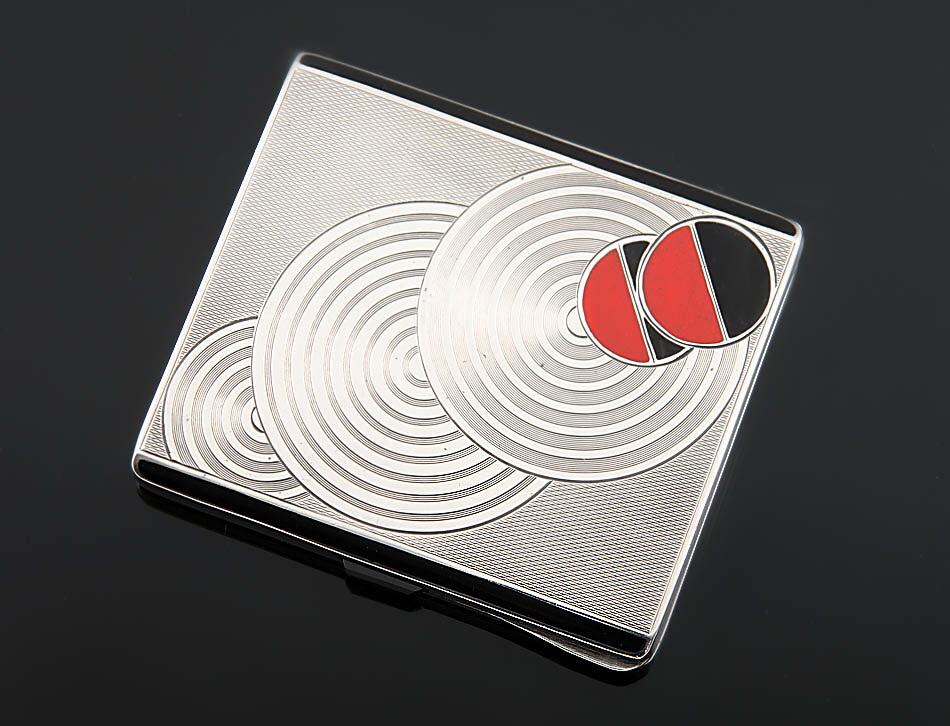 Art Déco. 925er und 935er Silber. Außen fein guillochiert, auf dem Deckel Muster aus konzentrischen Ringen und zwei runden Flächen mit schwarzem und rotem Email. Bodeninnenseite verspiegelt, Deckel innen mit netzartigem Muster. 8 x 7,3 x 0,9 cm. Nur mäßige Gebrauchsspuren. Ca. 210 g netto.