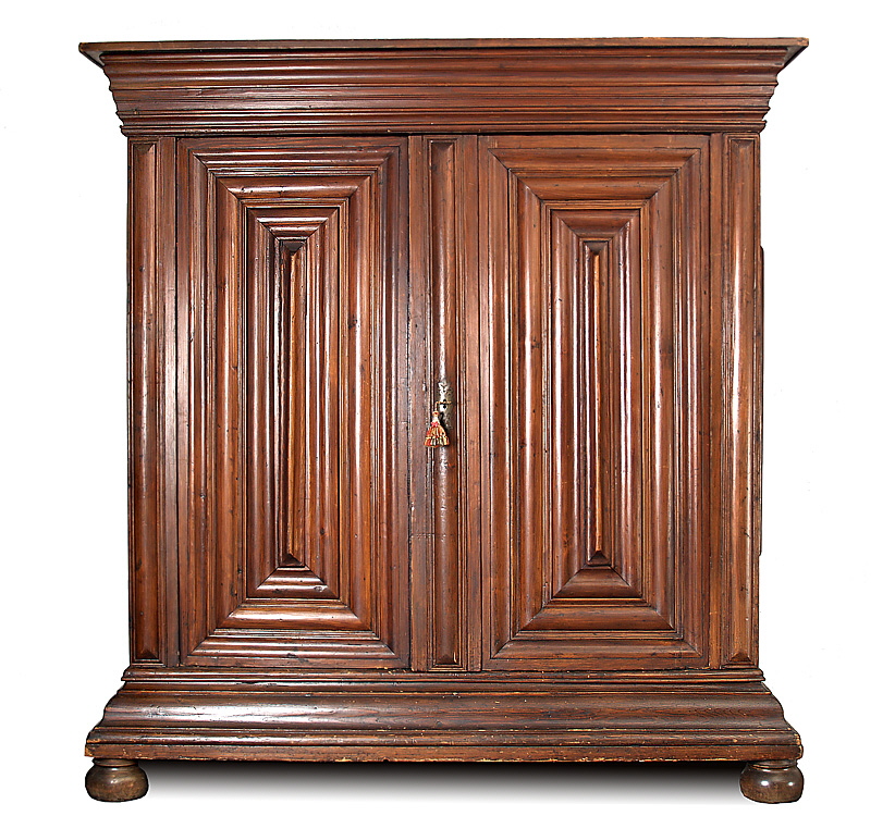 Mitte 18. Jh.. Nadelholz, dunkelbraun gebeizt. Zwei Türen, ausladendes, profiliertes Gesims, vorn Kugel-, hinten kantige Füße. Innenausstattung fehlt. H 219 cm, B 207 cm, T 74,5 cm. Zustand C (kleinere alte Bestoßungen, Alters- und Gebrauchsspuren, partiell alter Wurmbefall).