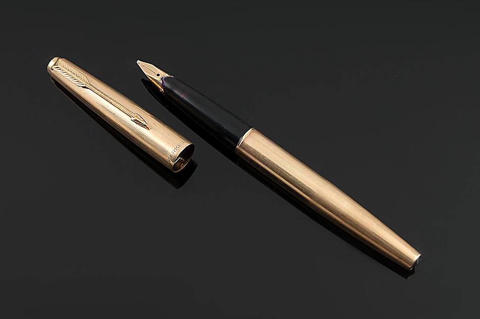 Parker. Goldfeder 585. Vergoldetes Metallgehäuse. Graues Kunststoffetui.