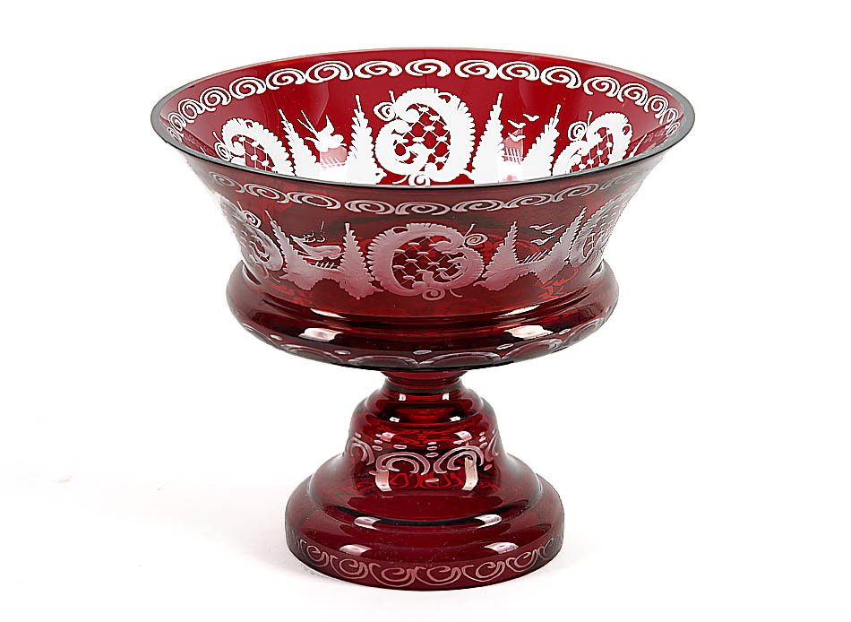 Süddeutsch. Konische Schale unten mit Wulst, abgesetzter gewölbter Fuß. Rot gebeiztes Glas, Mattschnittdekor. H 17,8 cm, D oben 21 cm.
