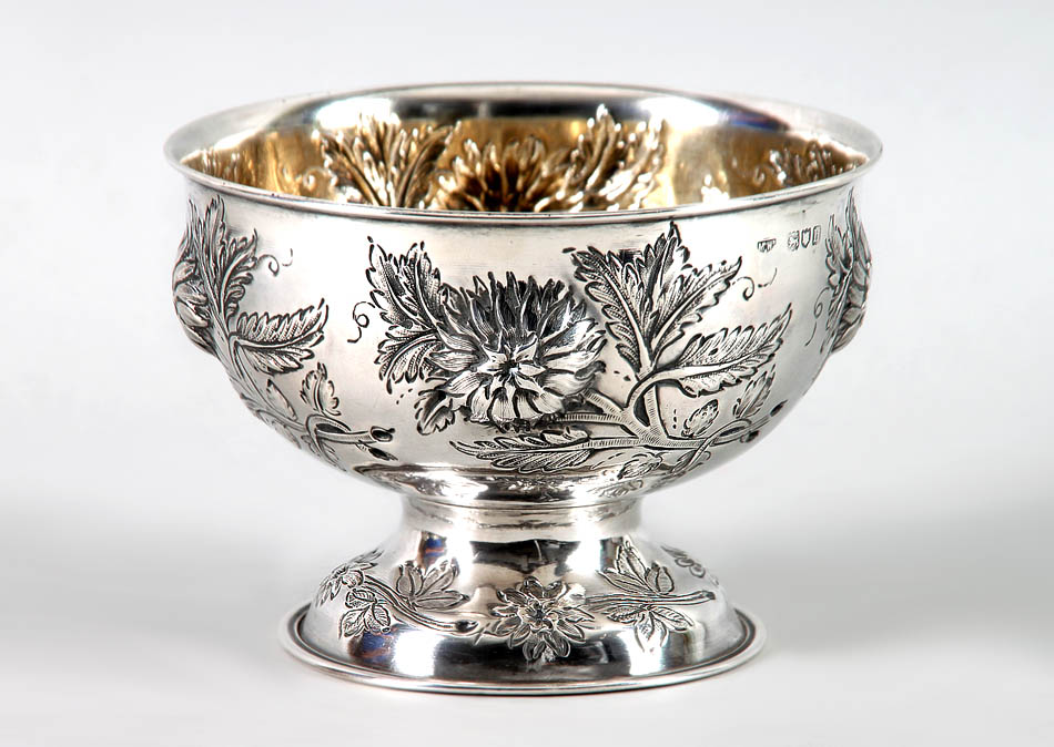 England, London, Sterlingsilber, Jahresbuchstabe ‚h‘ für 1903. Runde, bauchige Form, eingezogener, gewölbter Fuß. Auf der Wandung umlaufende Blumenrankenreliefs. H 10,4 cm, D 14,6 cm. 239 g.