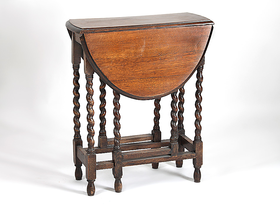 England. Eiche, dunkelbraun gebeizt. Gedrehte, gedrechselte Beine mit Verstrebungen, zweigeteilte, klappbare Tischplatte. H 73 cm, L 85 cm, B 61,7 cm. Zustand B/C.