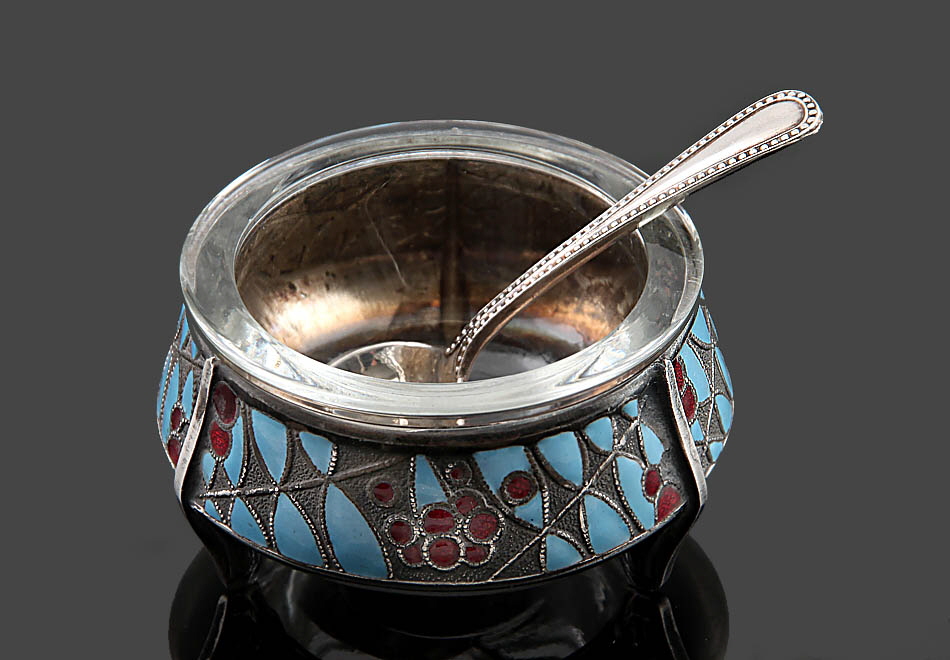 Metall versilbert, buntes Cloisonné, Glaseinsatz. H 3,5 cm. Dazu ein versilbertes Löffelchen.