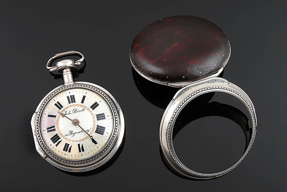 Um 1800. Silbergehäuse, vergoldetes Uhrwerk. Emailzifferblatt sign.: Joh. Riedl in Regensburg, auf der Rückplatine: Joh. Nicolaus Hiltel in Regensburg. Röm. Ziffern, vergoldete Zeiger. Gangbar, Schlüssel fehlt. D 65,5 mm. Dazu das orig. silberne Uhrenetui, auf der Unterseite mit Schildpatt verziert.
