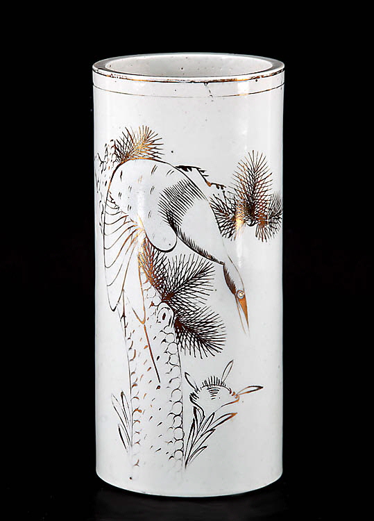 China, Ch’ing-Dynastie, am Boden undeutliche rote Siegelschriftmarke, um 1875-1908. Weiß glasiertes Porzellan. Auf der Wandung in Gold Vogel auf einem Kieferngeäst. Gold altersbedingt stellenweise etwas berieben. H 27,8 cm. Chin. Echtheitszertifikat von 1986 liegt vor.