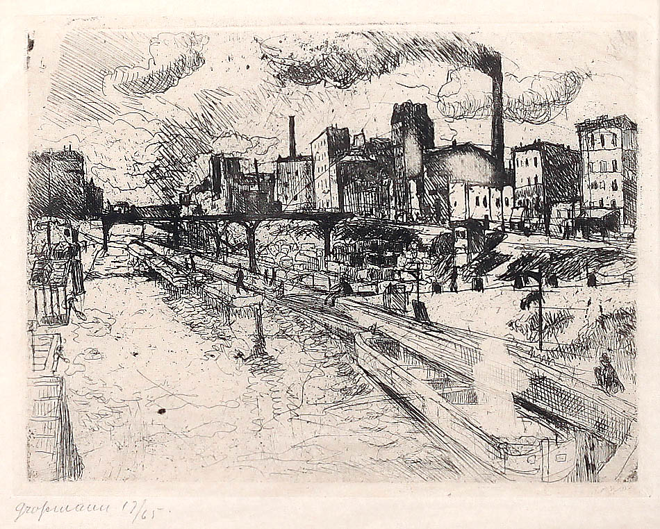 1882 Freiburg i. Br. 1941; deut. Maler und Grafiker. „La villette“. Radierung, li. u. handsign. Großmann, betit., Aufl. 17/65. 15 x 19,2 cm. Passepartout, vergl. R..
