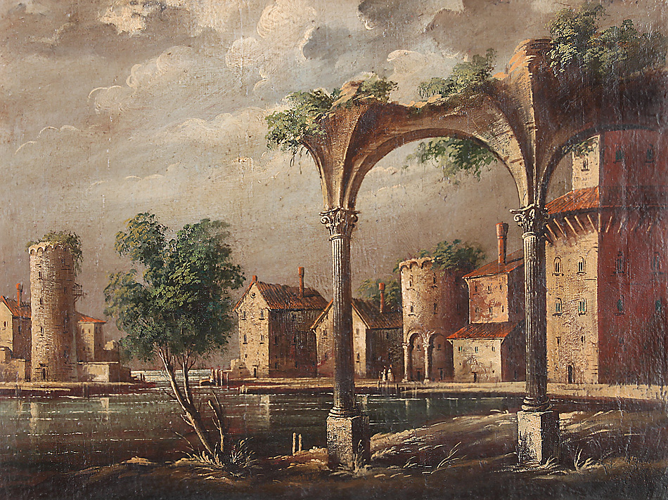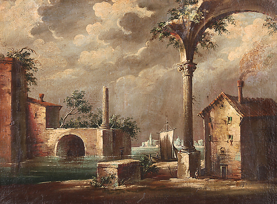 1712-1793. Zwei Gemälde: Landschaften mit Häusern und antiken Ruinen. Öl/Lwd., doubl., jeweils 44,5 x 59,5 cm. RR.