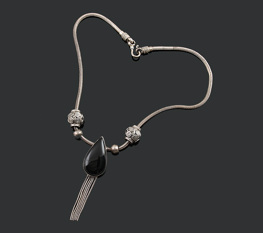 925er Silber. Großer Anhänger mit schwarzem Onyxtropfen. Hakenschließe.