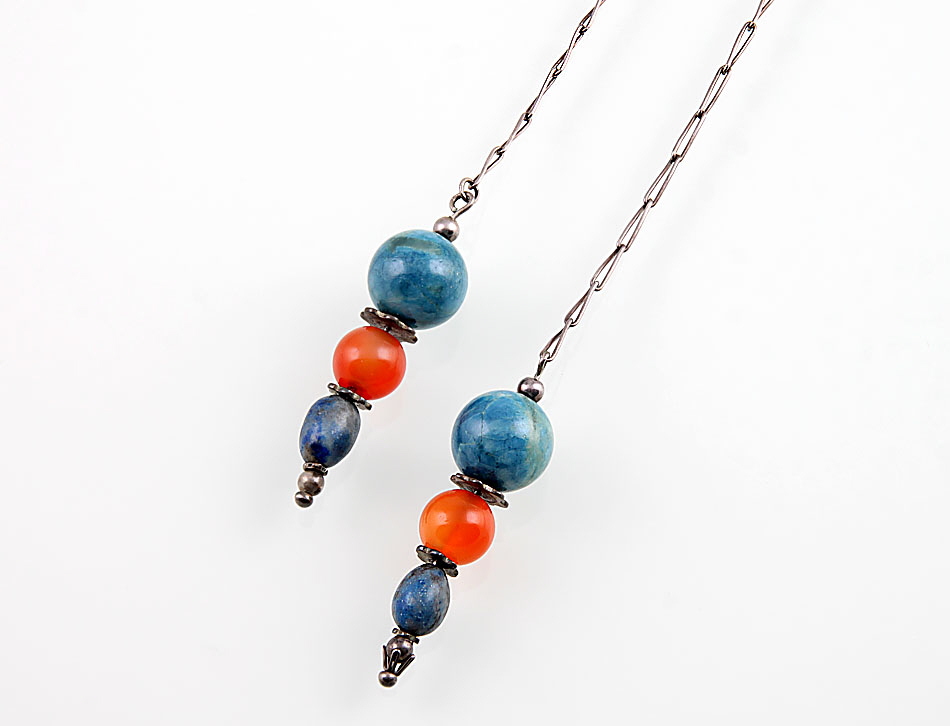 Silber. Offene Gliederkette, verschiedene zu Kugeln geschliffene und polierte Farbsteine. L ca. 76 cm. 25,7 g brutto.
