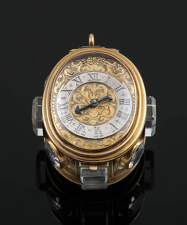 Wien, Ende 19. Jh.. Ovales, vergoldetes Gehäuse. Auf Seiten und Boden Verzierungen aus geschliffenem Glas. Fein graviertes Zifferblatt, versilberter Ziffernring mit röm. Ziffern, einzeigerig, gebläuter Zeiger. Vergoldetes Wiener Spindeltaschenuhrwerk, gangbar, Schlüssel fehlt. 60 x 44 x 31 mm.