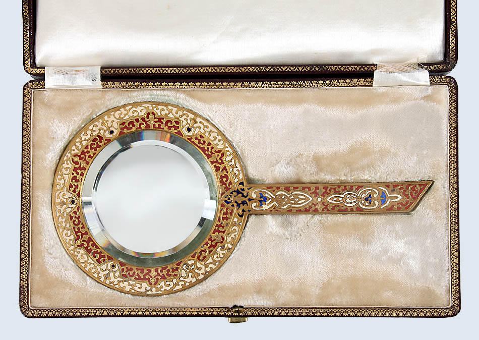 Frankreich(?), ca. Ende 19. Jh.. Messing vergoldet, feines stilisiertes Rankenmuster aus weißem, rotem und blauem Email. L 21,5 cm. Orig. Etui mit dunkelroter, goldgeprägter Lederkaschierung.