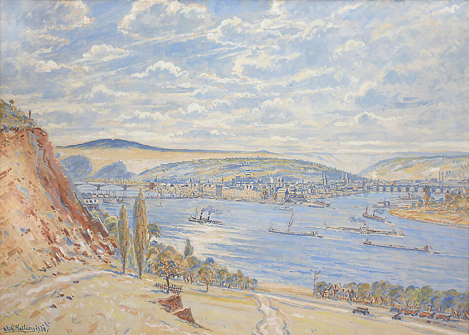 „Ansicht von Koblenz mit der Moselmündung“. Li. u. sign. Wilh. Hartung, dat. 1930. Aquarell/Papier, ca. 37,5 x 52,5 cm (Bildausschnitt). Vergl. R..