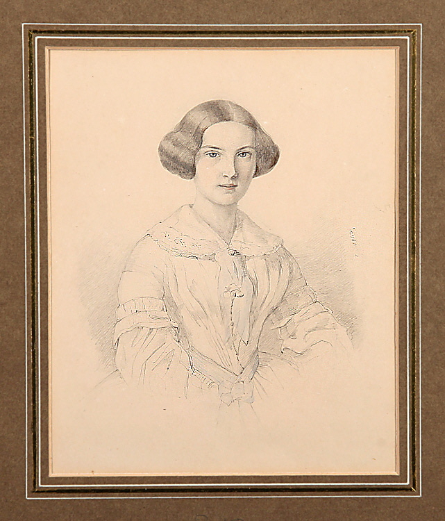 1813 Paris – 1888 München; deut. Maler. Studium an der Münchener Akad., ab 1828 Ausbildung bei Guérin in Paris. „Bildnis einer jungen Frau“. Unsign., am rechten Bildrand dat. 8/4 1843. Bleistift/Papier, 15 x 13,2 cm. Mit den linken Bl.Ecken auf Passepartout montiert.