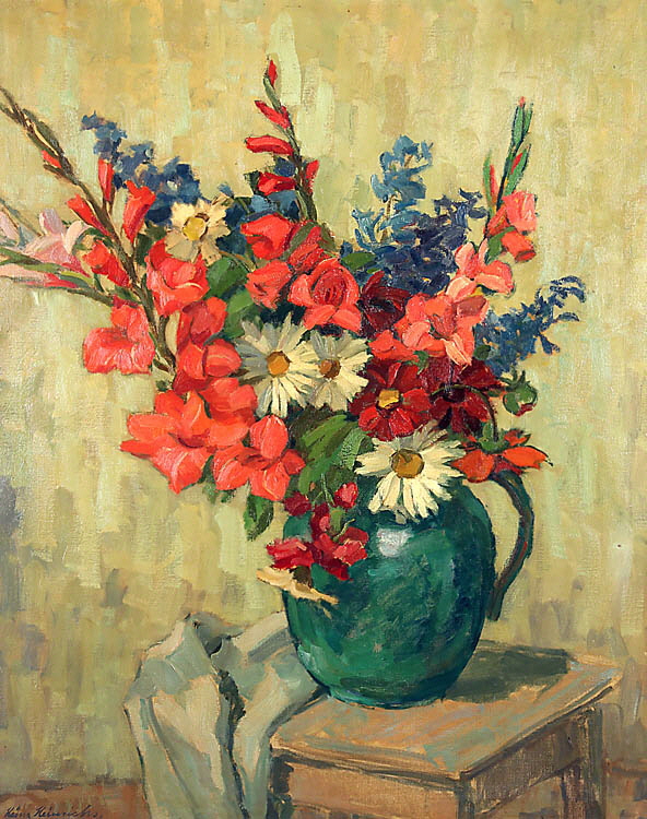 „Großer Blumenstrauß in grüner Vase“. Li. u. sign. Heinz Heinrichs. Öl/Lwd., 101 x 80,5 cm. R..