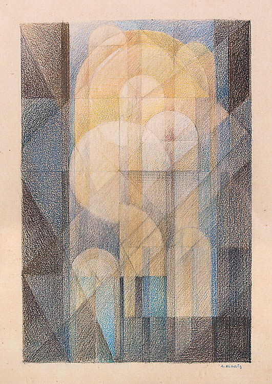 1880 Dresden -1959; deut. Maler, Grafiker und Keramiker. Prof. an der Keramischen Fachschule in Bunzlau. „Ohne Titel“. Um 1956. Re. u. sign. A. Hennig. Buntstifte/Papier, 27,5 x 18,5 cm. Vergl. R..
