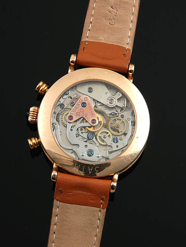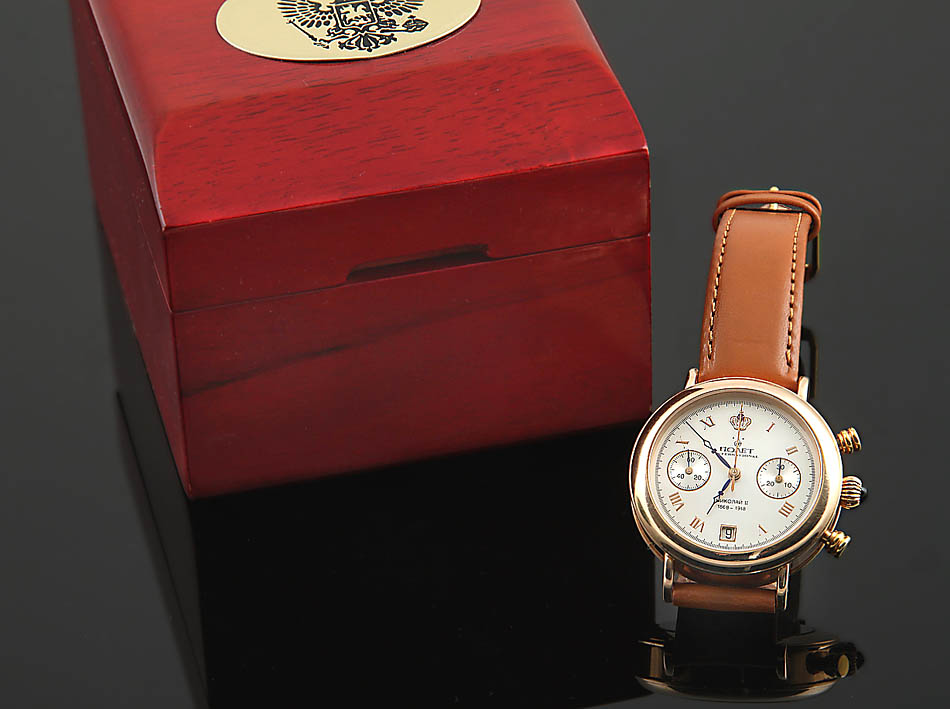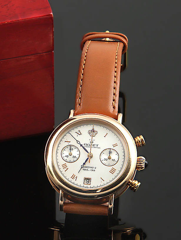Poljot International Nicolai II. In Deutschland hergestellt. Modellnr. P 3133.1956612, Produktionsnr. 03615, Verkaufsdatum: 31.3.2001. Gehäuse Ro.G. 585. D über Krone 42 mm. Krone mit blauem Saphircabochon. Saphirglas, Glasboden. Silbernes Zifferblatt mit goldenen röm. Ziffern, auf der XII Kronenapplikation mit Rubin, Datum bei VI, kleine Sek. bei IX, gebläute Zeiger. Werk mit Handaufzug, gangbar. Stopp-Funktion bedarf der Revision. Hellbraunes Lederarmband mit Dornschließe. Sehr gepflegter Erhaltungszustand. Orig. Präsentationsbox.