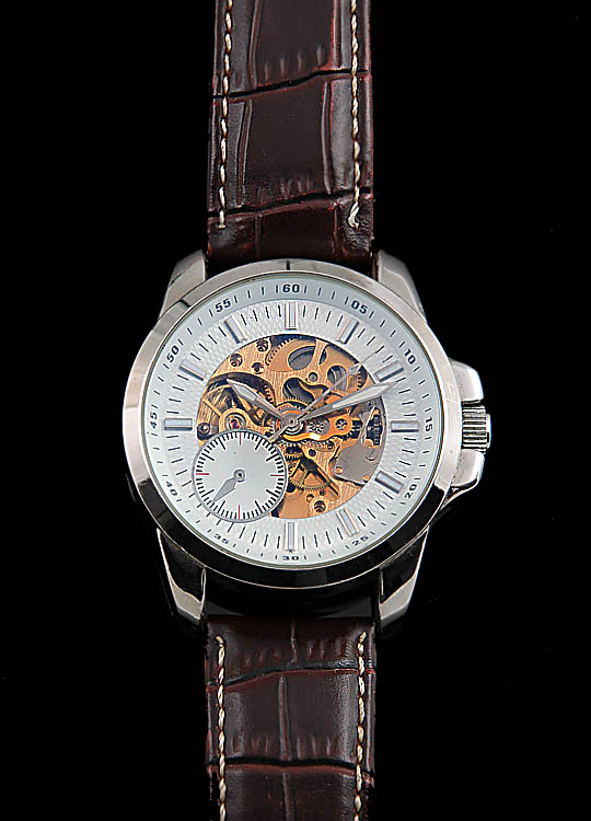 Shenhua 9284. Rundes Gehäuse mit Saphirglas und gläsernem Boden. D über Krone 48 mm. Mittig offenes Zifferblatt mit Blick auf das Uhrwerk, weißer Ziffernkranz mit Leuchtziffernstrichen und Leuchtzeigern, Zentralsek.. Automatikwerk, gangbar. Nur mäßige Gebrauchsspuren. Dunkelbraunes Lederarmband mit Dornschließe abgetragen.