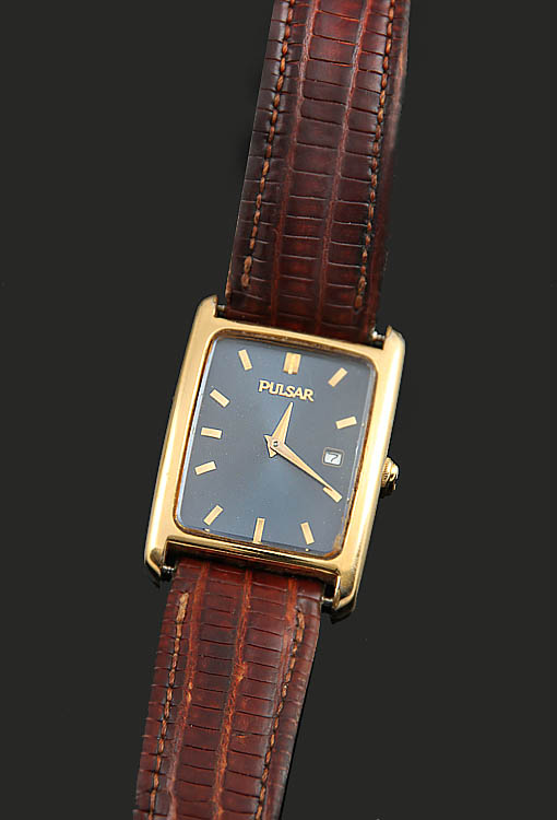 Pulsar. Japan. Rechteckiges, vergoldetes Gehäuse. 36 x 26 mm. Nachtblaues Zifferblatt, goldene Ziffernstriche und Zeiger, Datum bei 3. Quartzwerk, gangbar. Braunes Lederarmband mit Dornschließe. Gebrauchsspuren.
