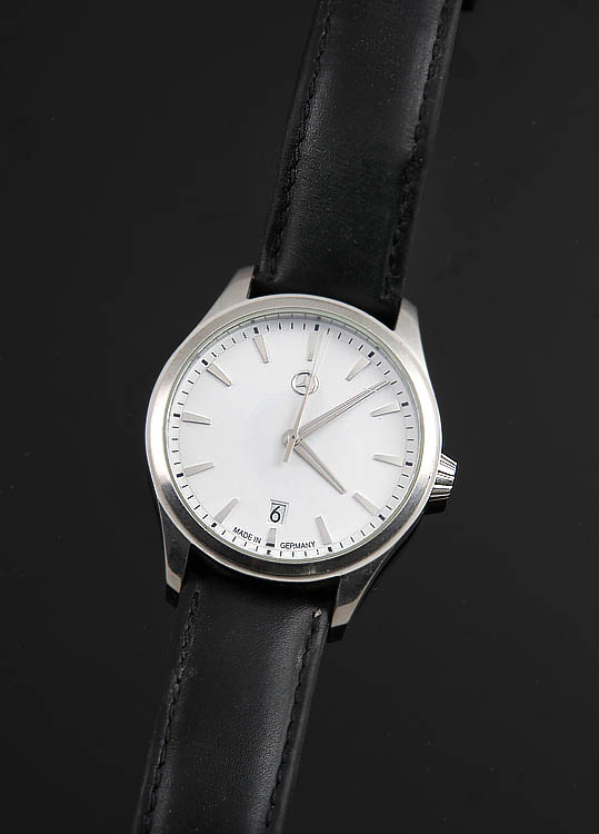 Mercedes-Benz Collection. Made in Germany. Silberfarbenes Gehäuse mit Saphirglas. D 39 mm. Weißes Zifferblatt, silberfarbene Ziffernstriche, Leuchtzeiger, Zentralsek., Datum bei 6. Quartzwerk, gangbar. Nur mäßige Gebrauchsspuren. Schwarzes Lederarmband mit Dornschließe.