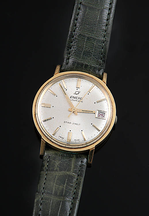 Enicar Automatic Ocean Pearl. Schweiz. Vergoldetes Gehäuse. D 34 mm. Silbernes Zifferblatt, goldene Ziffernstriche und Zeiger, Zentralsek.. Automatikwerk, gangbar. Gebrauchsspuren, Glas verkratzt. Dunkelgrünes Lederarmband mit Dornschließe.