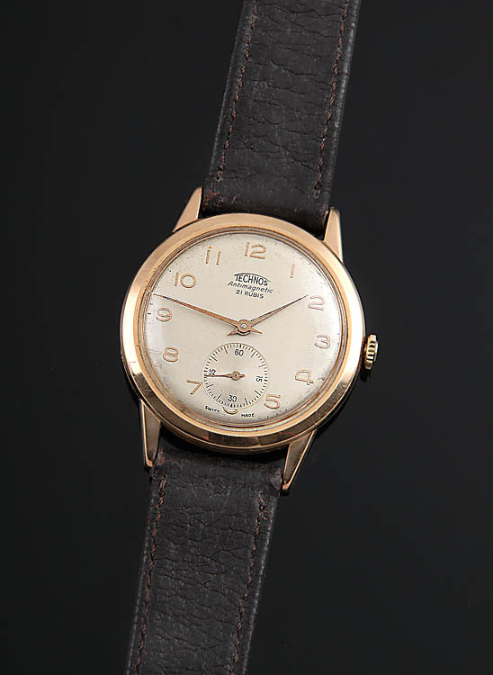 Technos. Schweiz. Flaches Gehäuse GG 750. D 35 mm. Silbernes Zifferblatt, goldene arab. Ziffern, Goldzeiger, kleine Sek. bei 6. Werk mit 21 Steinen, Handaufzug, gangbar. Gehäuse ohne Werk ca. 9 g. Gebrauchsspuren, Glas mit verschiedenen Kratzern. Dunkelgraues Lederarmband mit Dornschließe abgetragen.