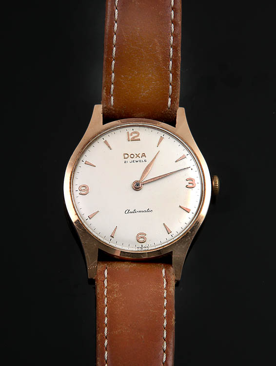 Doxa Automatic. Gehäuse GG 585. D 35 mm. Silbernes Zifferblatt, goldene Ziffernstriche und Zeiger. Automatikwerk mit 21 Steinen, gangbar. Gehäuse ohne Werk ca. 6 g. Mäßige Gebrauchsspuren, Glas mit mehreren Kratzern. Hellbraunes Lederarmband mit Dornschließe, mäßig abgetragen.