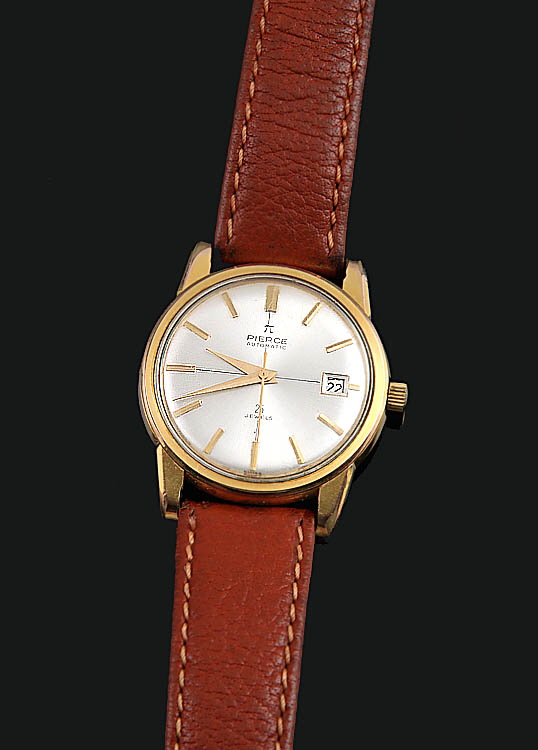 Pierce Automatic. Schweiz, 1960er Jahre. Vergoldetes Gehäuse. D 35,5 mm. Silbernes Zifferblatt, goldene Ziffernstriche und Zeiger, Zentralsek., Datum. Werk mit 25 Steinen, gangbar. Gebrauchsspuren. Hellbraunes Lederarmband mit Dornschließe.